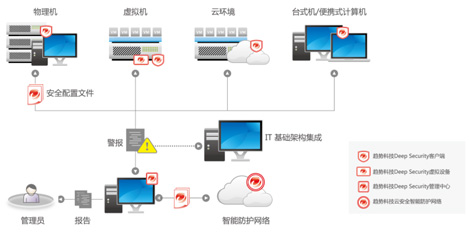 趨勢科技Deep Security客戶端:該小型軟件組件部署在受保護的服務器或虛擬機上,用于實施數據中心的安全策略(防惡意軟件、Web信譽、入侵阻止、防火墻、完整性監控和日志檢查)。
